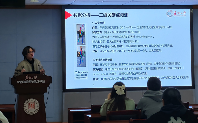 第三组同学张钰峰从模型分类的独特视角,分享了《机器学习和深度学习在体育领域的应用》。他系统地介绍了按技术路线和按数据类型对模型进行分类的方法,并重点讲解了面向自由行人的人脸及动向识别系统。该系统通过多摄像头协作,实现了多角度数据融合与自然行走姿态的精准识别。此外,他还提及了生成式人工智能(GenAI)及其模型幻觉问题,为同学们带来了前沿的学术观点,引发了大家的深入思考。