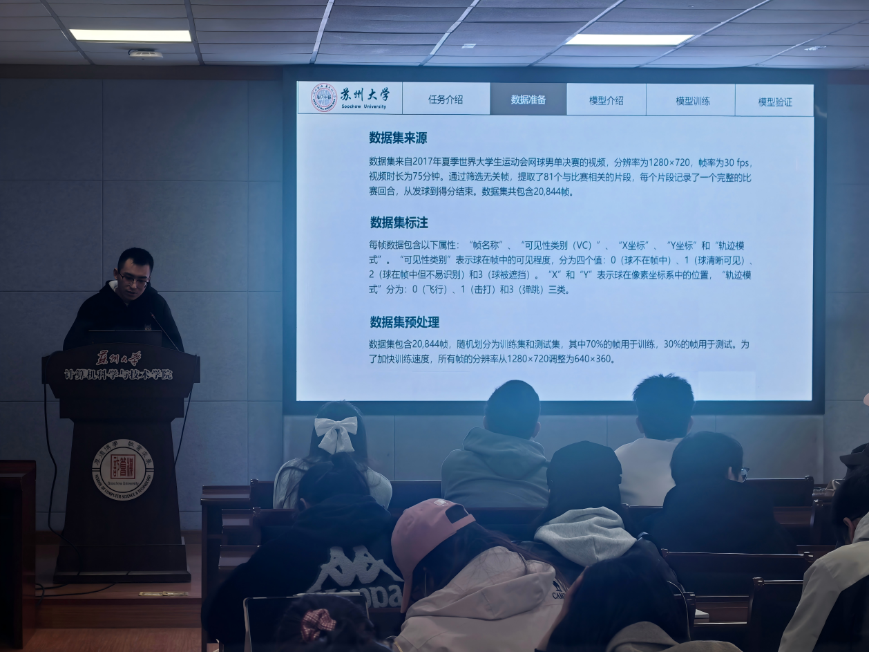 第四组同学李相越聚焦于《AI +体育:深度学习在网球轨迹追踪中的应用》,进行了深入细致的讲解。他全面介绍了任务背景、数据准备、模型架构、训练和验证的全过程,重点阐述了输入输出数据的处理方法、模型架构设计的巧妙之处以及损失函数的设计原理。通过实验展示,直观地呈现了模型在网球轨迹追踪中的卓越效果,并对位置误差的合理性进行了深入分析,让同学们对深度学习在体育领域的具体应用有了更为透彻的理解。