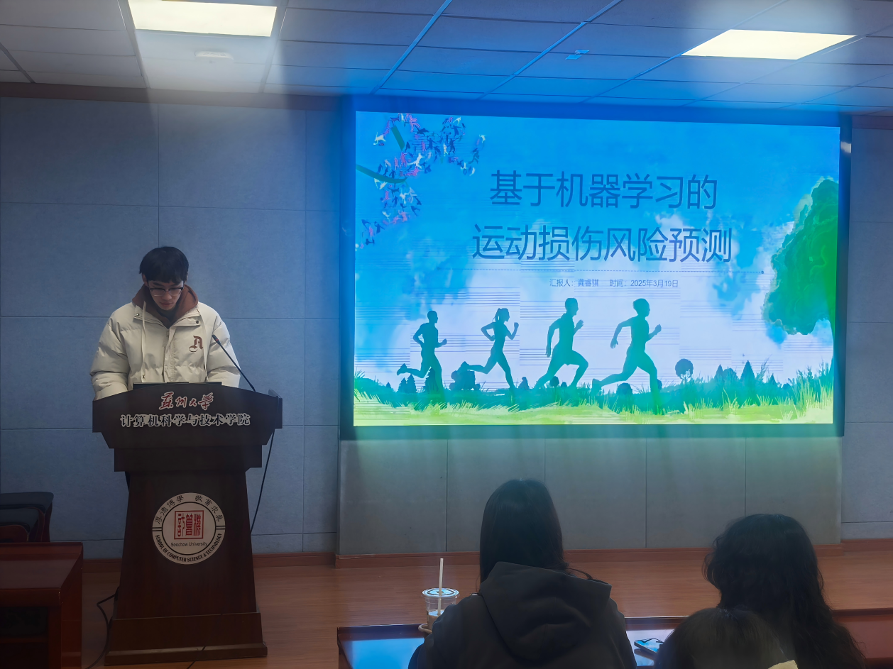随后,第二组同学龚睿骐带来了题为《基于机器学习的运动损伤风险预测》的精彩汇报。他从运动损伤的基本概念、影响因素及预测挑战入手,着重讲解了训练负荷的内外部衡量指标和FFM评估模型。在机器学习应用方面,他详细介绍了数据收集的六个关键维度和常用技术手段,为同学们清晰地呈现了如何利用机器学习技术预测运动损伤风险,为相关研究提供了新的思路与方向。