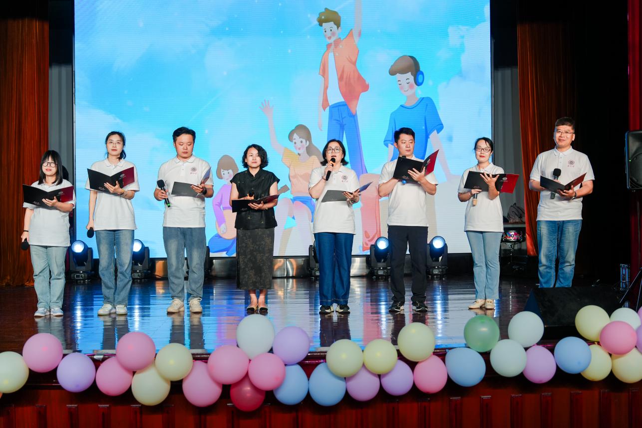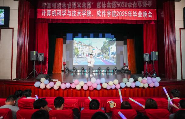 由学院党委书记陈国凤老师、副书记李恩秀老师与六位辅导员老师共同带来的诗朗诵《梧桐絮语,代码生花》成为晚会的温情时刻。八位老师用真挚动人的语言,回忆了与同学们相处的点点滴滴。"你们是算法中最独特的参数,是代码里最璀璨的注释"等诗句,既展现了计科特色,又饱含深情,引发了在场学生的深深共鸣。