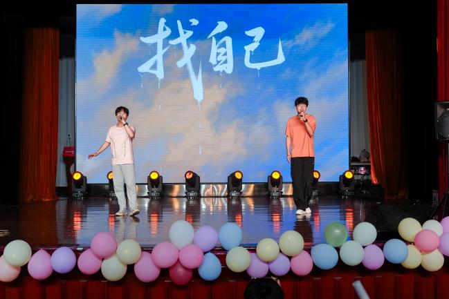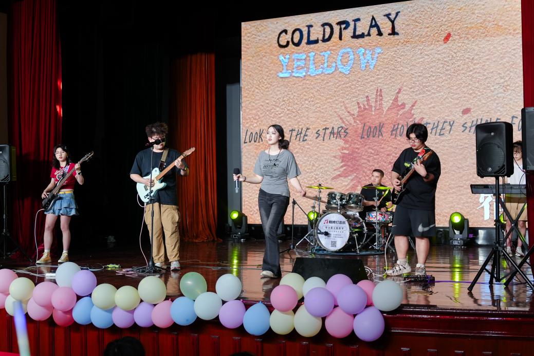 学生乐队"宿莽"(五月天音乐社)带来的歌曲串烧《想去海边》《无地自容》《Yellow》展现了五位学子的音乐才华。主唱缪佳叡富有磁性的嗓音配合乐队默契的演奏,将三首风格迥异的歌曲完美呈现,赢得了观众的阵阵掌声。