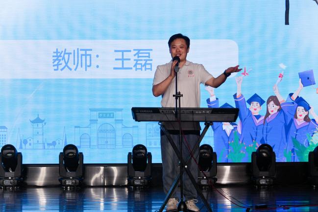 晚会最后,王磊老师带来键盘弹唱《那些年》、《突然好想你》。他用温暖的嗓音和深情的演绎打动了全场观众,现场观众打开手机闪光灯,点点星光与舞台灯光交相辉映,营造出温馨感人的氛围。