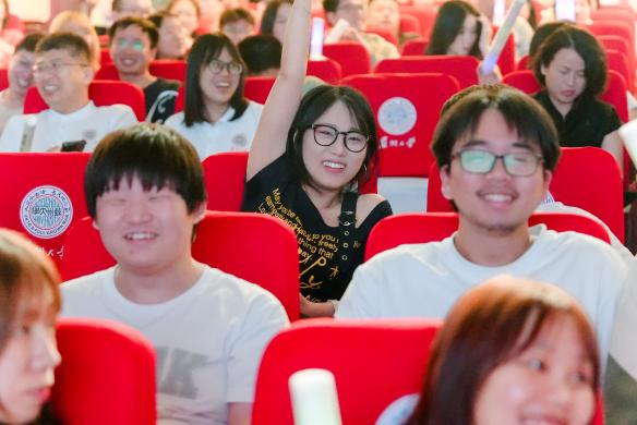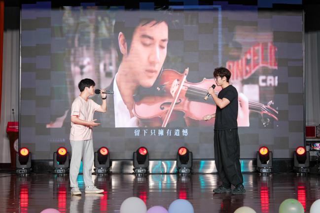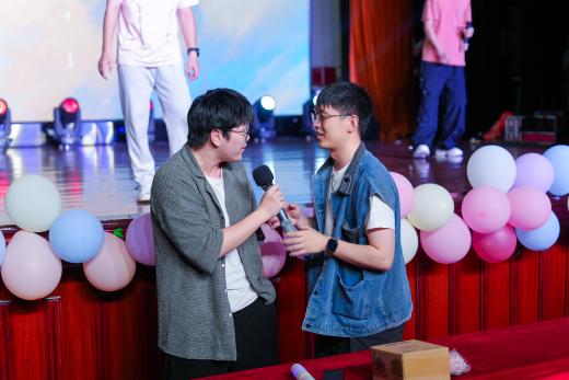 紧接着在歌曲表演中,李戬俊与谢卓良同学共同演绎的《找自己》别出心裁,表演过程中他将话筒递给台下观众,邀请两位同学即兴合唱。这种新颖的互动形式引发全场热烈响应,台上台下默契配合,将现场气氛推向高潮。