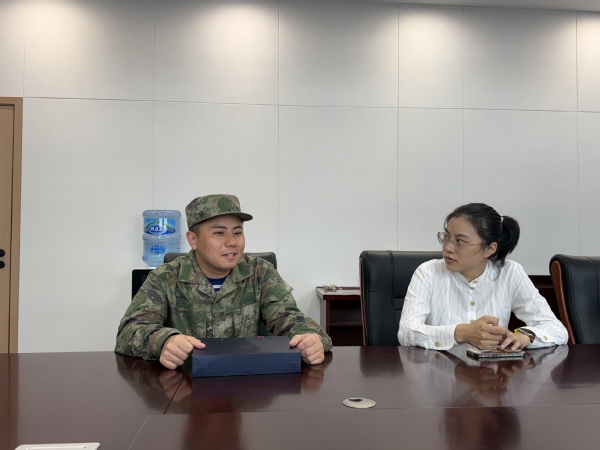 在与屠笑宸的交流中,仇馨玥详细询问了他役前训练的日常作息、训练进展与生活适应情况,叮嘱他在训练中既要刻苦磨砺意志、提升军事技能,也要注意劳逸结合、照顾好自身身体,尽快完成从“大学生”到“海军战士”的角色转变。同时,仇馨玥向屠笑宸转达了学院领导和老师们的殷切期望:希望他能珍惜身穿戎装的荣誉,牢记保家卫国的神圣使命,在海军部队这个广阔平台上,以坚定的信念克服艰苦挑战,以顽强的毅力锤炼过硬本领,将在学院习得的严谨思维与钻研精神融入军旅生活,在深蓝的海域书写属于自己的青春华章,为国防事业贡献青年力量。