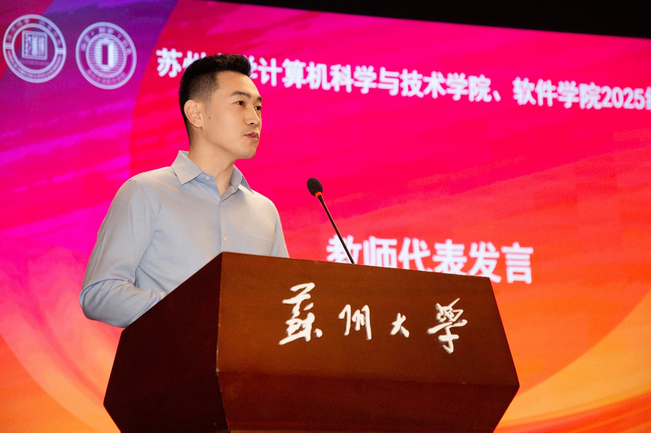 典礼在雄壮的国歌声中拉开帷幕,全体师生肃立齐唱国歌,展现出昂扬向上的精神风貌。随后,现场播放了由新生自编自导的入学视频《砺剑·铸芯》,镜头记录下同学们入学教育以及军训期间的坚毅身影与青春风采,也为大学生活奏响了奋进的序曲。新生代表、计算机科学与技术专业王子欣同学在发言中回顾了十二载寒窗的拼搏历程,表达了对苏大深厚底蕴与优良学风的向往。她呼吁同学们在人工智能迅猛发展的时代背景下,不仅要掌握专业知识,更要提升解决问题的能力,做好终身学习的准备,“用代码书写对祖国最清澈的爱”。