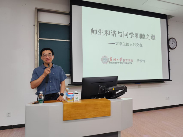教育学院副院长吴铁钧副教授为Beat3652025级新生开展了题为“师生和谐与同学和睦之道”的专题讲座。讲座从大学教育目标、宿舍关系、学业进程与情感生活等维度出发,引导同学们理性看待大学生活,逐步调整心理预期。吴教授通过人与动物的对比,阐释了人际交往的社会意义,并引入社会交换理论、公平理论等心理学原理,深入浅出地讲解了人际关系的建立与维系之道。他结合校园生活中的典型实例,剖析了“急于求成”、“自我中心”等常见交往误区,并提出具有操作性的调适方法与沟通策略。讲座还推荐了《社会心理学》(戴维·迈尔斯著)与《当代社会心理学》(阎力著)作为延伸阅读,鼓励同学们系统学习、科学运用。整场讲座内容扎实、案例生动,有效帮助新生掌握人际相处与情绪管理的科学方法,为营造和谐积极的大学生活奠定心理基础。