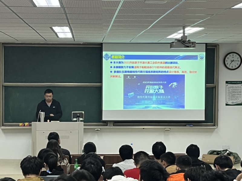 主持人为各位同学介绍了开放原子开源大赛的主要内容、形式,嘉宾老师们为同学们讲解三个不同赛道的赛题、解题方向,同学们听完介绍后纷纷表示这次大赛非常有吸引力,跃跃欲试。其中,来自中国船舶科学研究中心的王建春老师为同学们介绍了一道由中国船舶702所申报的赛题,吸引了同学们的兴趣。