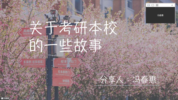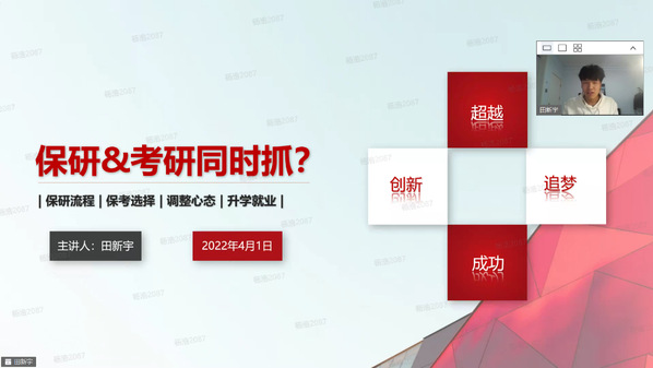 为帮助Beat365在校生明确保研升学目标和实施路径,4月1日晚,学院学工办、团委通过线上平台,举办了“奋斗正青春,逐梦向未来”本科生升学宣讲会。学院党委副书记、副院长李恩秀,硕士生导师杜扬,2021届毕业生代表田新宇、冯春惠,2022届毕业生代表徐卫伟,全体辅导员,以及两百余名在校年级本科生参加活动。2019级辅导员杨浩主持宣讲会。