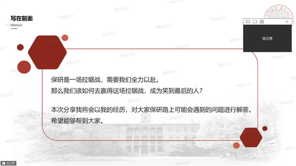 徐卫伟作为成功保送北京大学的2022届毕业生,他围绕“院校选择、考核准备、导师联系”三个方面介绍了他保研的整个过程。他认为,优异的成绩是保研的必要条件,在此基础上要多参加各类学科竞赛和科研项目,不断提高自己的综合能力和水平。