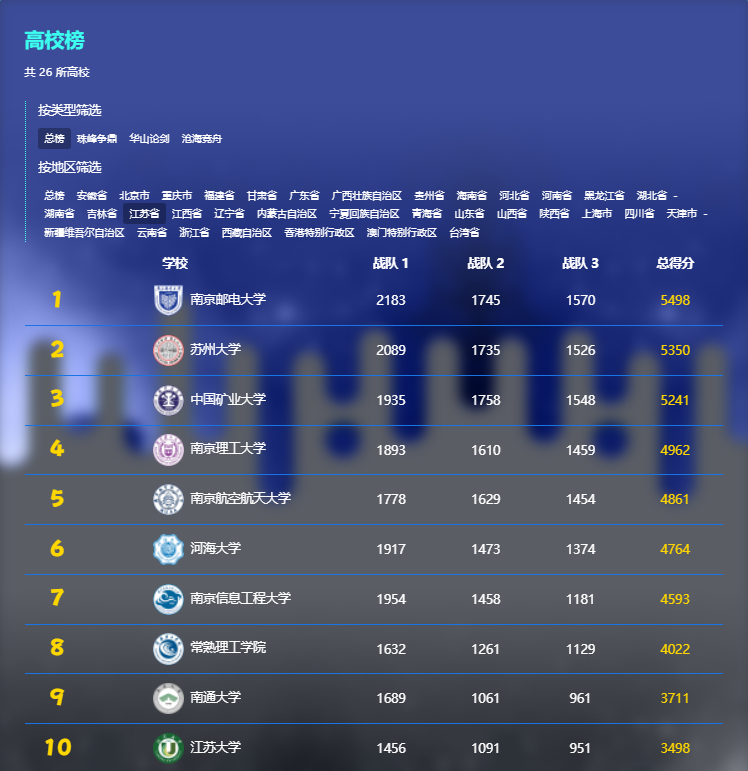 1 | 干将 | 殷九思、丁誉洋、于立恒、陆佳浩、王志庞、孙孜斌、王雨、周进一、林志诚、韩则进 | 全国金奖(第6名) 江苏省冠军 | 高校排行榜 |