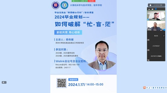 3. 举办指导讲座。为进一步做好2024届寒假期间本科毕业生就业工作,为毕业生提供不间断就业服务,促进毕业生高质量充分就业,破解学生就业的“忙·盲·茫”,2024年1月17日下午14:00,计算机学院2024届毕业生就业“寒假暖心行动”之毕业规划暨家长课堂活动顺利举行。