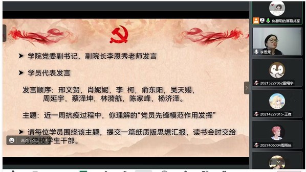 10月19日,学院分党校召开第68期党的基本知识培训班暨第47期预备党员培训班开班典礼,开班典礼结束后,分党校组织所有学员线上召开了“疫情下的党员先锋模范作用发挥”主题的交流分享会,会上十位学员结合近一周抗疫经历的所思所感,进行了交流发言。