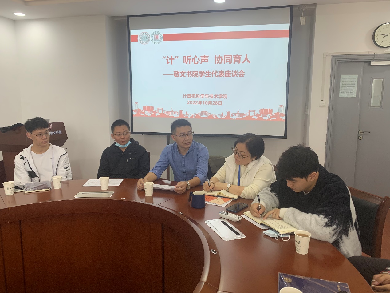 为了开好此次座谈会,学院在计算机学院的全体敬文书院同学中进行了问卷调查,主要对加入敬文书院原因、进入书院后的发展以及两院教学、管理、服务方面的建议意见进行摸底。会上,李恩秀首先对书院同学们的精神面貌和学习生活状态高度肯定,然后结合调研结果和与会同学就两院管理模式和条例、分工进行深入探讨。她表示,敬文书院的同学来自不同专业,多学科交叉融合氛围为大家开拓眼界、提升综合素质能力提供平台的同时也带来与本专业同学交流不足等问题。为此,她任命2020级优秀学生代表王力擎为敬文-计算机学院联络组组长,希望同学们尽快适应两院学子身份,加强互动交流,主动向优秀学长学姐学习取经,多与本专业同学来往,成长为卓越型人才。