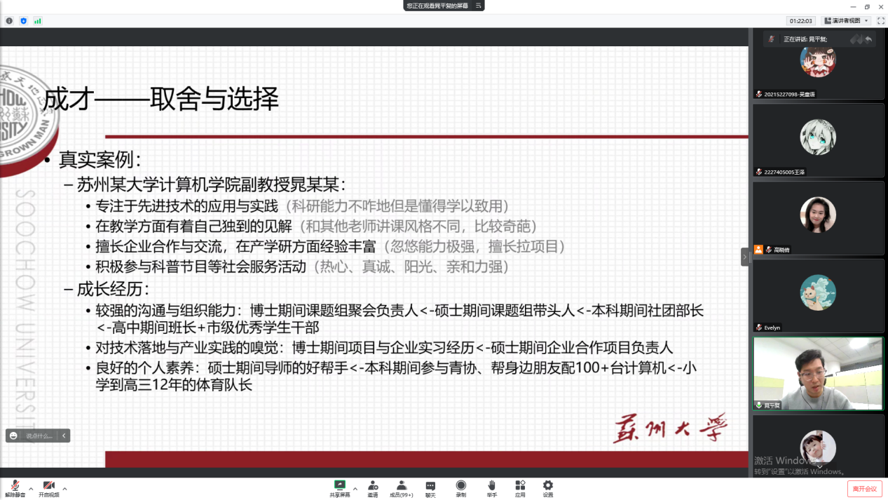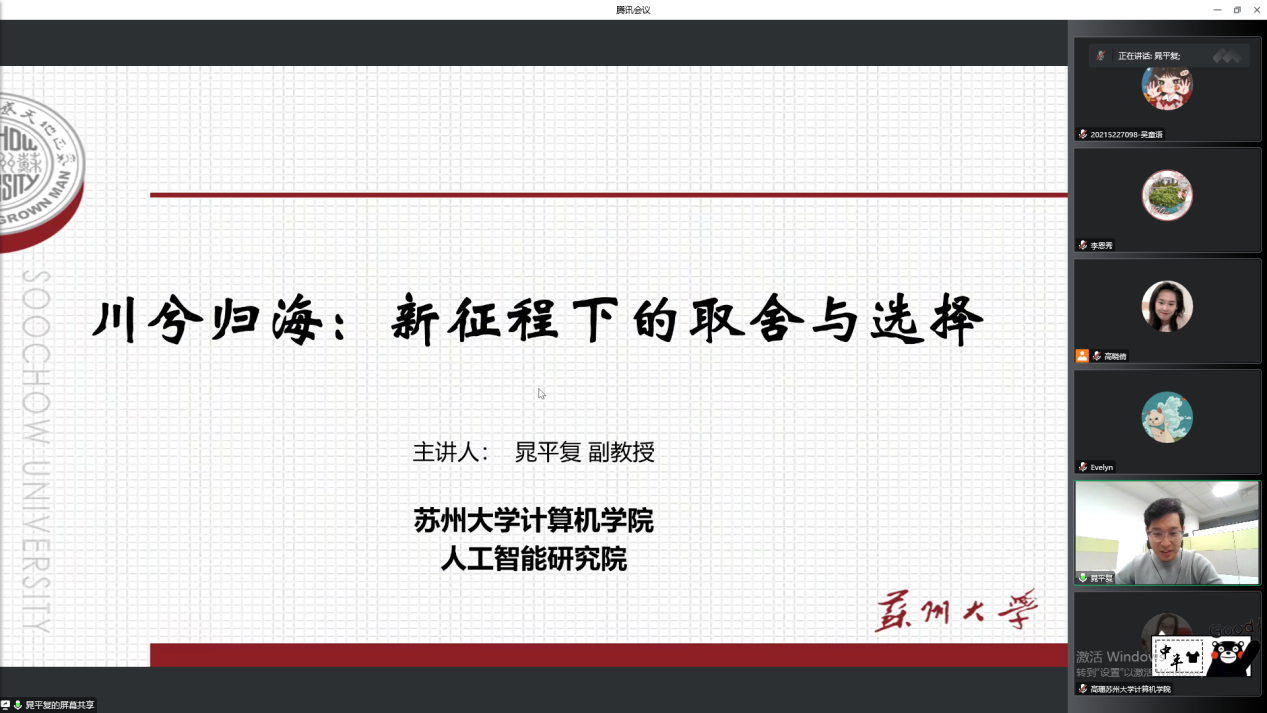 11月9日晚,Beat365唯一官方网站人工智能研究院晁平复副教授为学院2022级新生开展了一场以“川兮归海:新征程下的取舍与选择”为主题的分享会。考虑到疫情防控安全,本次分享会以线上会议的方式举办,近三百人线上参加了讲座。活动由学院党委副书记、副院长李恩秀主持。
