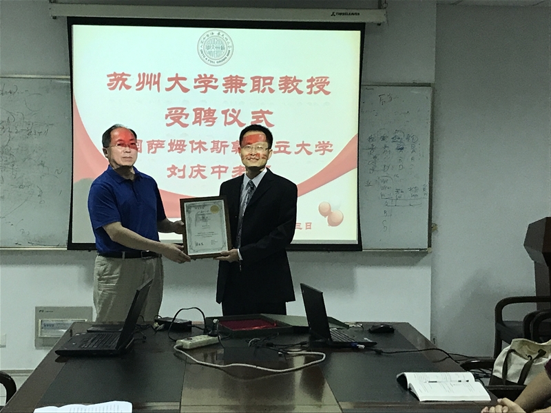 6月23日下午,萨姆休斯顿州立大学(SHSU)刘庆中老师受聘为我校兼职教授仪式在理工楼321室举行。李凡长院长受熊思东校长委托,向刘老师颁发了聘书,并为刘老师佩戴校徽。