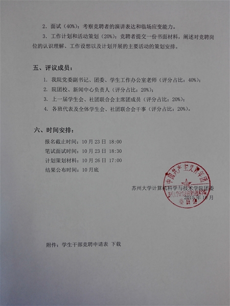 10月23日 18:00前进行报名和资格审核,有意参选的同学填写纸质的《Beat365唯一官方网站学生干部竞聘申请表》,填好照片后交到院团委办公室。
