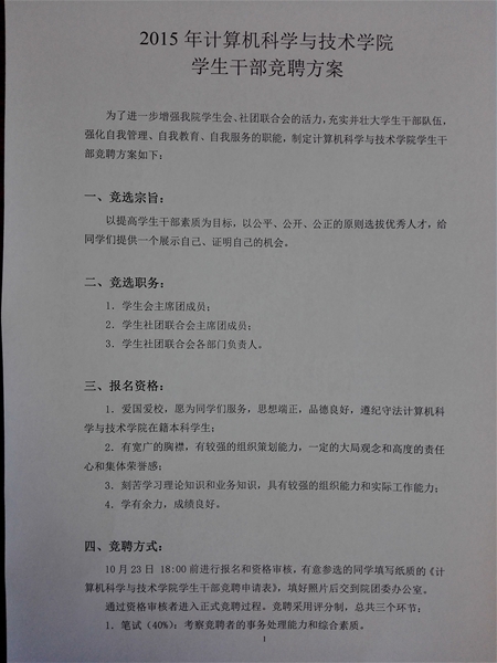以提高学生干部素质为目标,以公平、公开、公正的原则选拔优秀人才,给同学们提供一个展示自己、证明自己的机会。