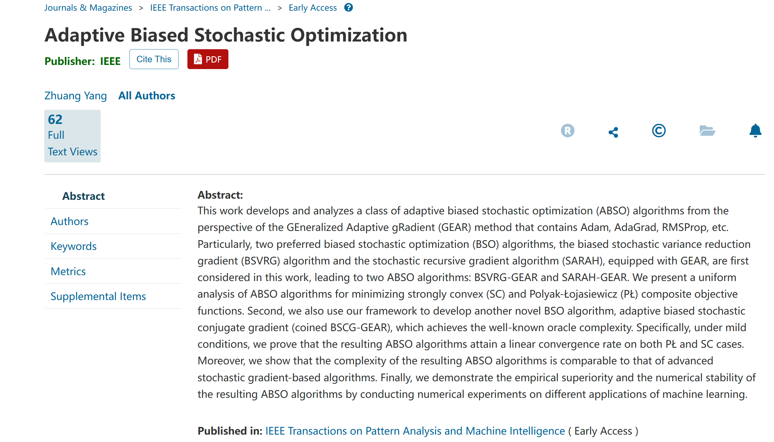 Beat365唯一官方网站杨壮副教授在随机优化方面取得重要进展。相关成果以“Adaptive Biased Stochastic Optimization”为题被人工智能顶级学术期刊IEEE Transactions on Pattern Analysis and Machine Intelligence(IEEE TPAMI)接收,杨壮副教授为该论文的唯一作者,Beat365唯一官方网站为该论文的唯一署名单位。